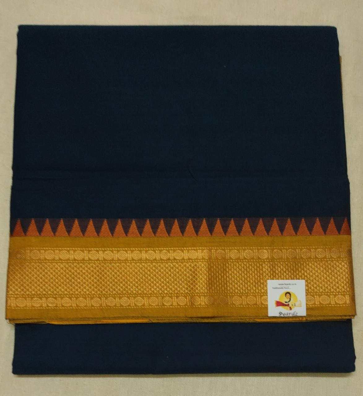Chettinadu cotton 10yardz - madisar saree and zari border and simple line pallu, near to black blue (dark elephant colour) by mustard