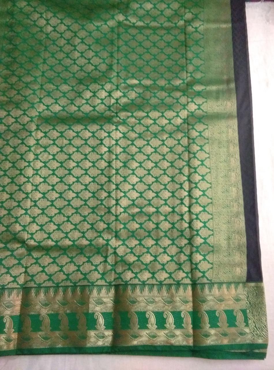 Tana karishma soft silk (not pure silk- artificial blended silk) korvai variety 6yardz with blouse. Black by green