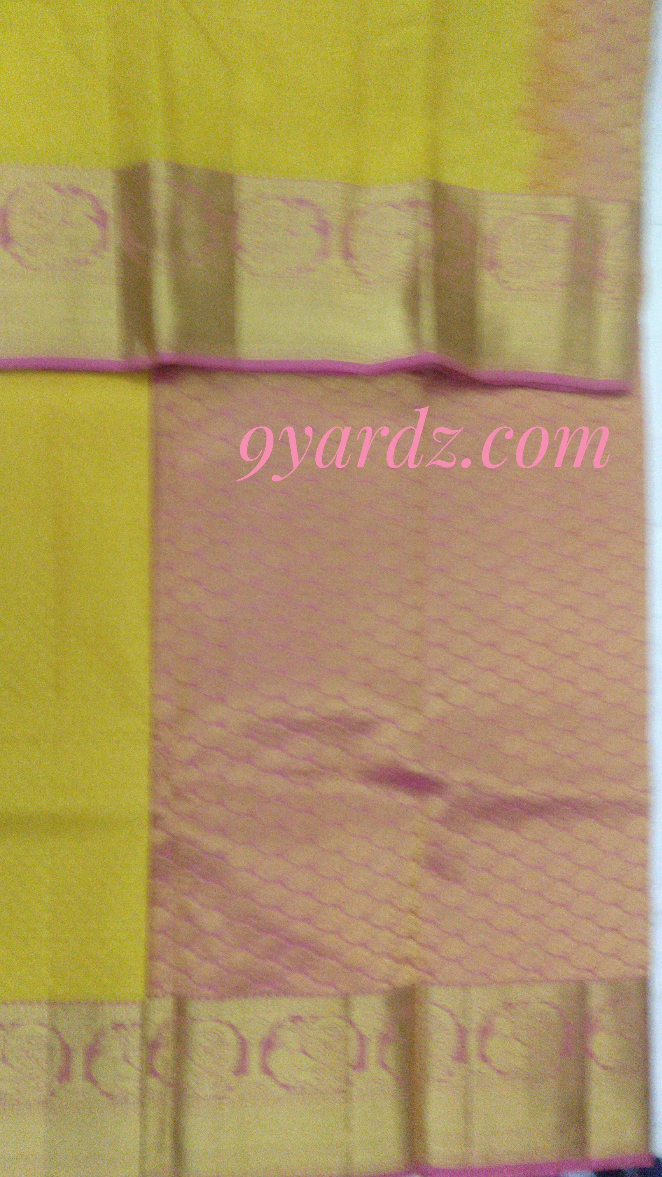 Yellow (embossed) pure silk saree with pink jari border and rich pallu - 6 yards